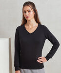 Women's long sleeve V-neck jumper. Soft feel/Cotton rich yarn. Fine gauge knit. Contemporary styling. Set in sleeves. 40°C Domestic wash. Size 8, 10, 12, 14, 16, 18, 20, 22, 24