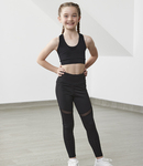 87% polyester/13% elastane. Opaque stretch fabric with a peached finish. Deep elasticated waistband with inner pocket. Mesh panels on thighs, front and back. Laser cut panels on lower legs.
