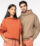 85% organic ringspun combed cotton/15% recycled polyester. Brushed back fleece. Drop shoulder style. Oversized fit. Lined hood. Herringbone taped neck. Half moon back yoke. Two front pockets. 2x1 ribbed cuffs and hem. Twin needle stitching. Tag free. Recycled polyester is made from post-consumer waste.