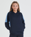 Unisex kids’ hoodie. Contrast sleeves and side panelling on contrast only. Ribbed cuffs and hem. Crossover hood neck at centre front. Zipped welt pocket in front panel side seam. Three-piece hood. Offered in contrast and solid colours. Tear-out label.